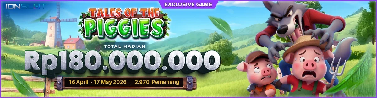 IDNSLOT menghadirkan game ekslusif terbaru yaitu Tales of the Piggies. IDNSLOT juga menghadirkan promosi cash drop ekslusif yang berlangsung mulai dari 16 April hingga 17 May 2026 setiap harinya pukul 00:00 WIB - 23:59 WIB. Total hadiah cash drop adalah sebesar Rp 180,000,000 yang akan dibagikan kepada pemain-pemain yang bermain di permainan Tales of the Piggies yang beruntung
